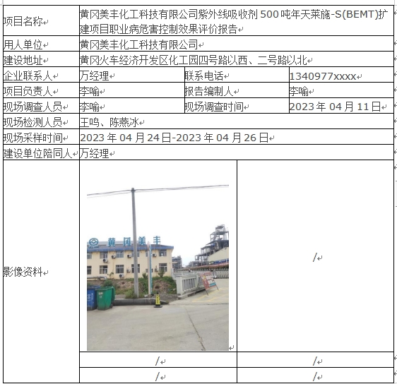 黃岡美豐化工科技有限公司紫外線吸收劑500噸年天萊施-S(BEMT)擴建項目